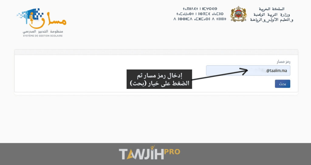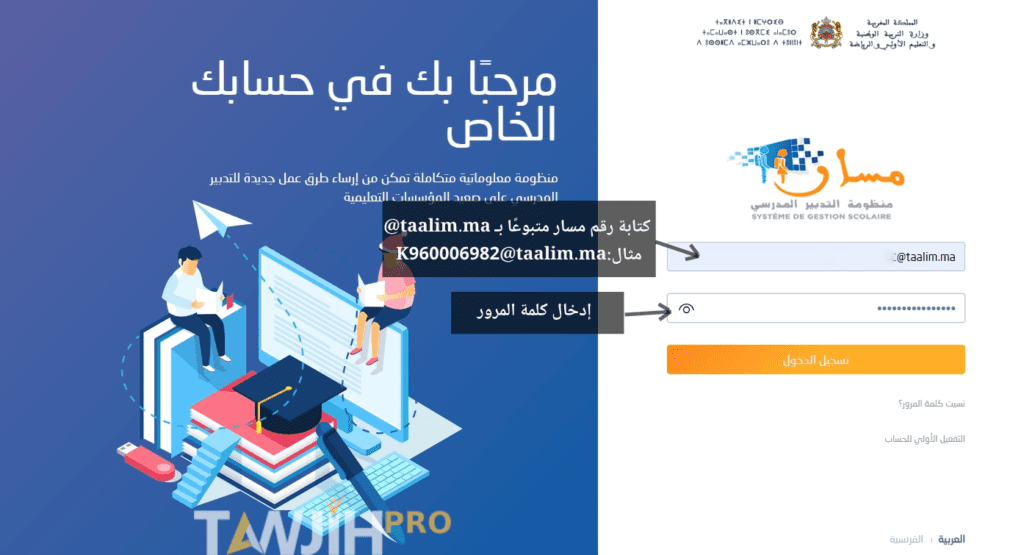 كتابة رقم مسار متبوعًا بـ “@taalim.ma” (مثال: [email protected])، ثم إدخال كلمة المرور .