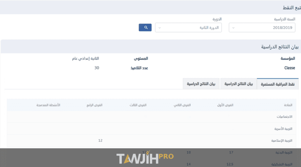 - بعد تسجيل الدخول، يتم الولوج إلى قسم “التمدرس“ للاطلاع على المعدلات والنقاط المحصلة في الامتحانات.