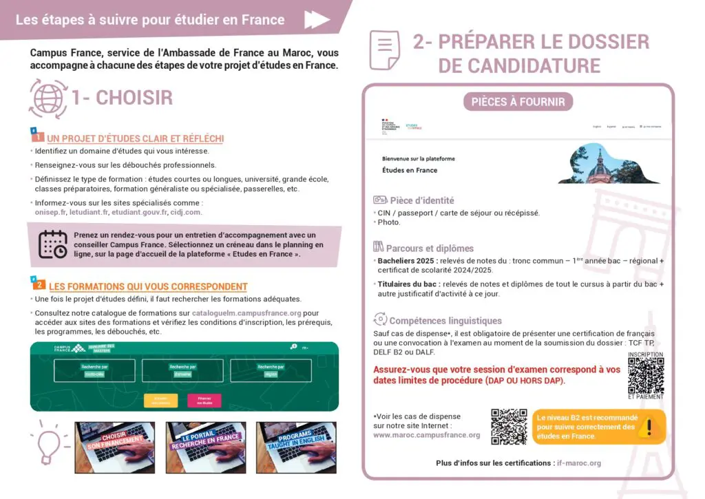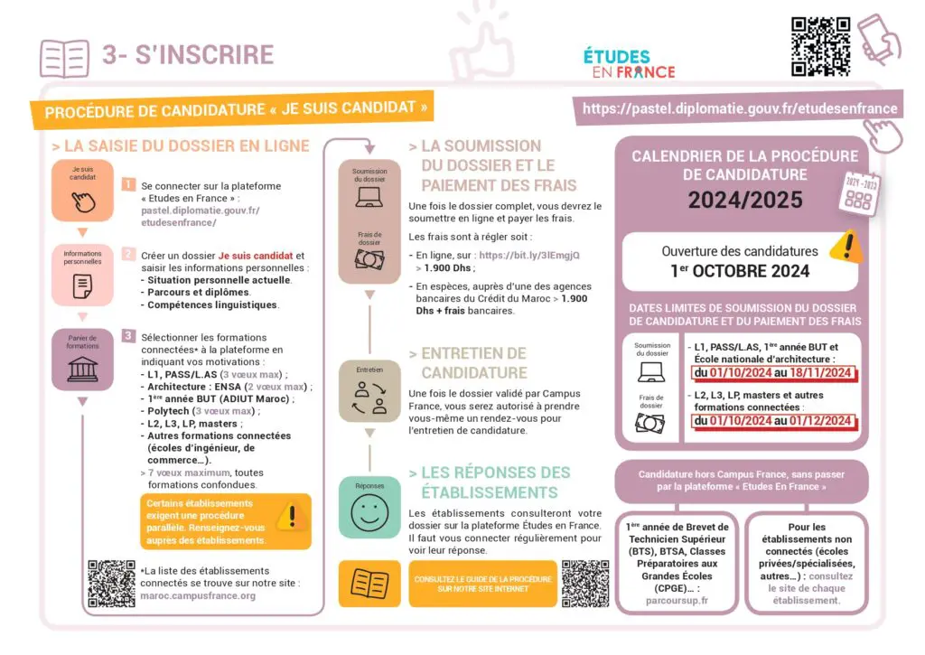 - التسجيل في منصة “Etudes en France”: يتم التقديم الإلكتروني ودفع رسوم الترشح عبر المنصة. الرسوم تبلغ 1900 درهم وتدفع إما عبر الإنترنت أو في وكالة Crédit du Maroc.