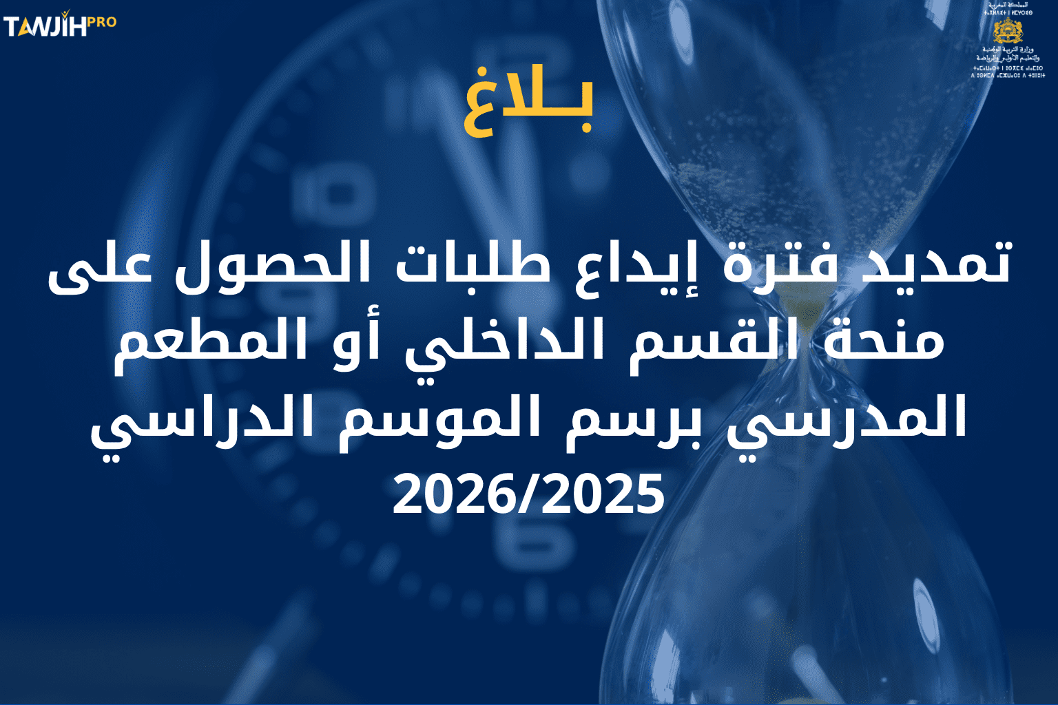 الصفحة الرئيسية مستجدات تمديد فترة إيداع طلبات الحصول على منحة القسم الداخلي أو المطعم المدرسي برسم الموسم الدراسي 2026/2025