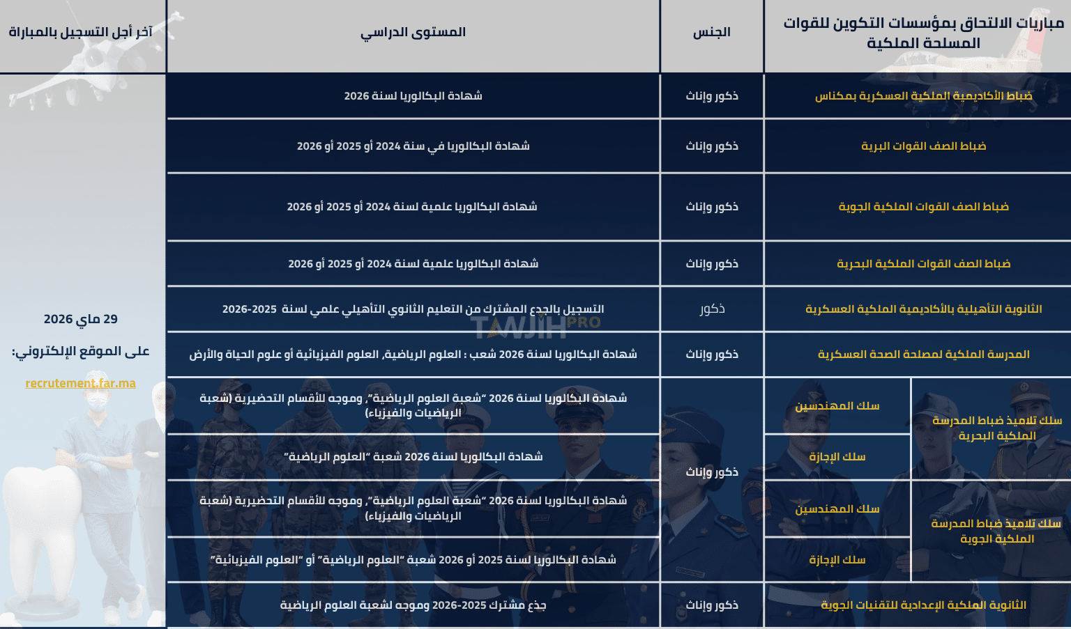 مخصصة لحاملي البكالوريا 2025 أو 2026 شعبة العلوم الرياضية أو العلوم الفيزيائية. لاجتياز تكوين تأهيلي وعسكري في شعبة الطيران.