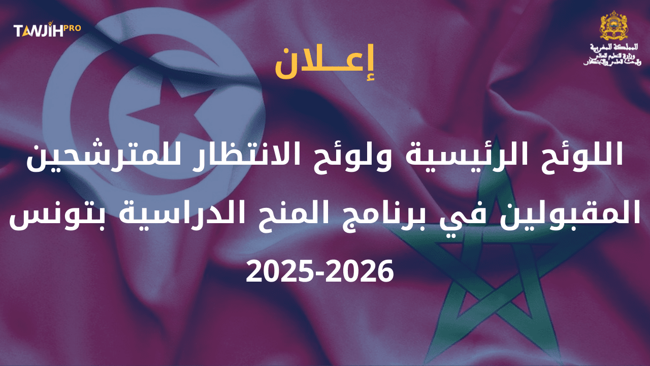 أعلن التعاون المغربي- التونسي و وزارة التعليم العالي والبحث العلمي والابتكار عن لوائح المترشحين المقبولين في برنامج المنح التونسية لسنة 2025-2026.
