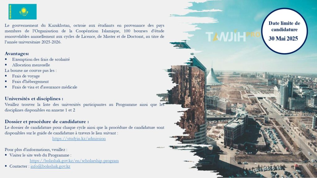 أو زيارة الموقع الرسمي للبرنامج: https://bolashak.gov.kz/en/scholarship-program