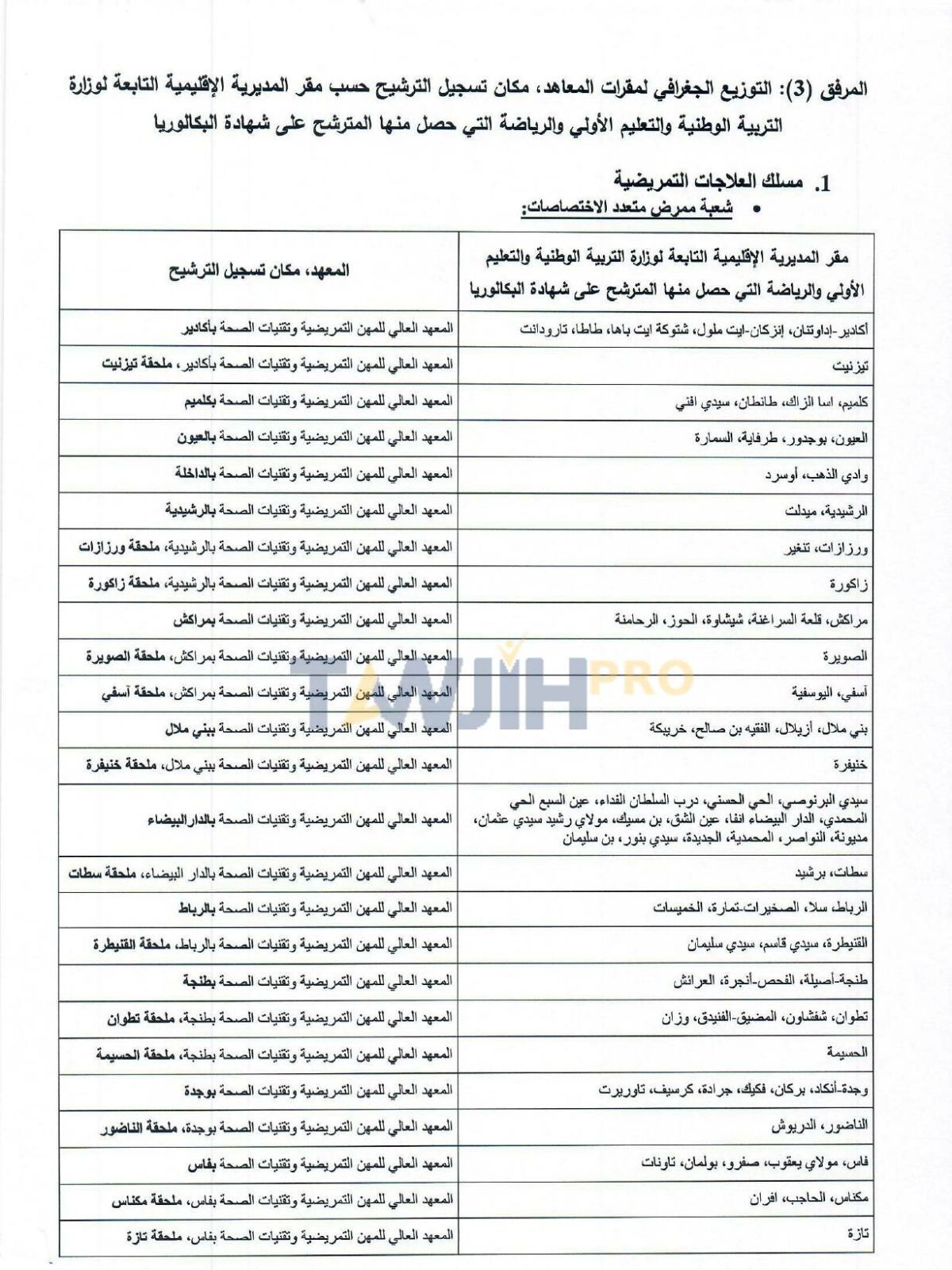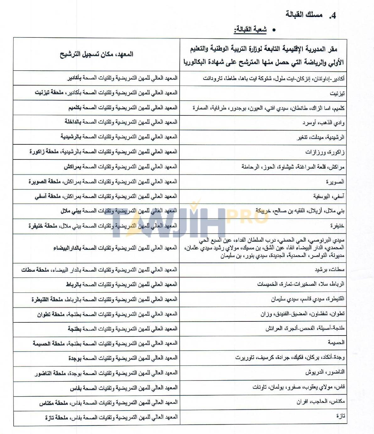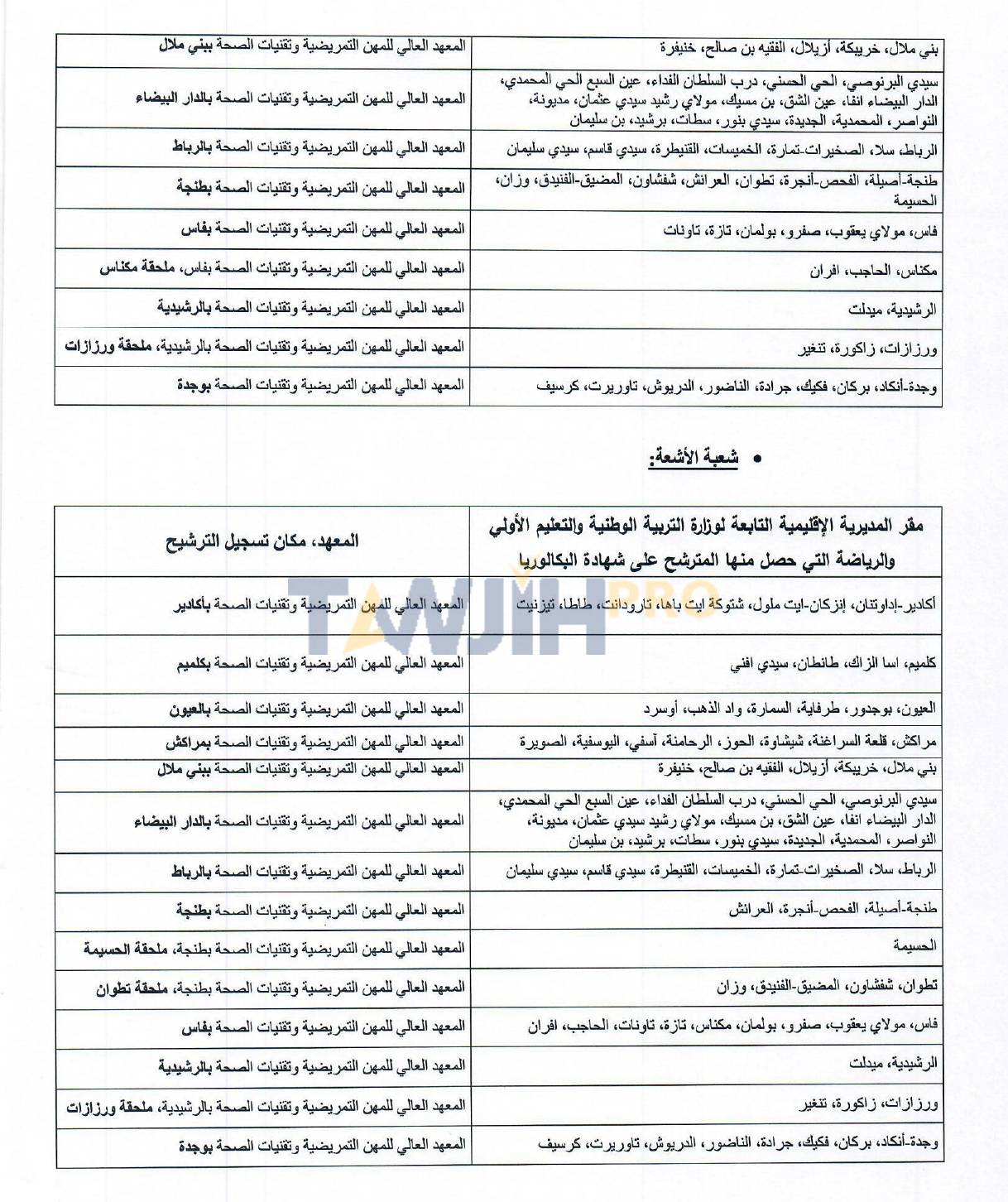 - يتم تحديد المعهد تلقائيا أثناء عملية الترشيح، وذلك بناء على المسلك والشعبة المراد التسجيل فيهما، ومقر المديرية الإقليمية التابعة لوزارة التربية الوطنية والتعليم الأولي والرياضة التي حصل منها المترشح على شهادة البكالوريا، وذلك كما هو موضح في الجدول: