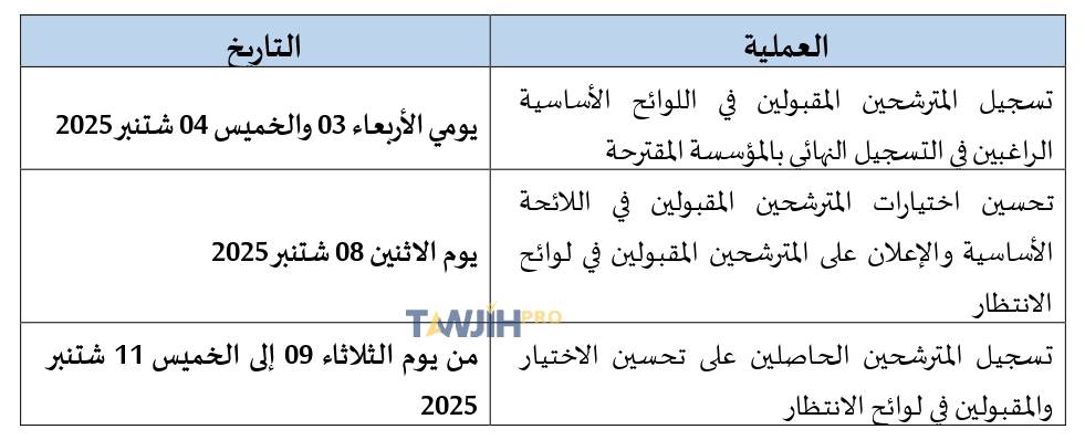 وسيتم التسجيل النهائي في المؤسسات ابتداء من يوم الأربعاء 03 شتنبر 2025 وفق الجدولة الزمنية التالية: