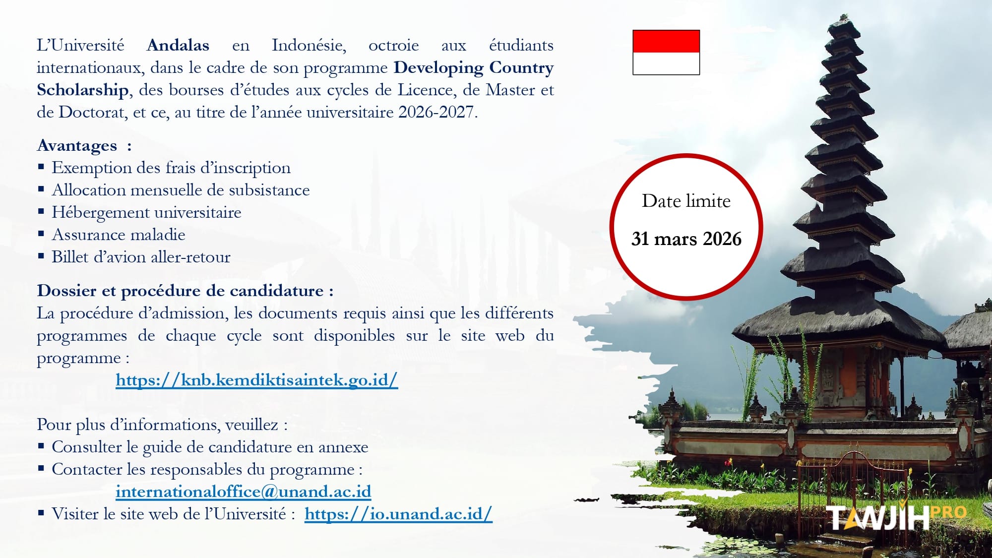 إذا كنت تفكر في متابعة دراستك الجامعية بالخارج والاستفادة من تجربة تعليمية دولية مميزة، فإن منحة جامعة Andalas بإندونيسيا برسم السنة الجامعية 2026-2027 تعد من الفرص المهمة التي يمكن أن تفتح أمامك آفاقاً علمية ومهنية جديدة. هذه المنحة تندرج ضمن برنامج KNB Scholarship (Kemitraan Negara Berkembang) الذي تشرف عليه وزارة التعليم العالي الإندونيسية، ويهدف إلى تعزيز التعاون بين الدول النامية عبر تمكين الطلبة الدوليين من متابعة دراستهم في الجامعات الإندونيسية مع الاستفادة من دعم مالي يشمل مصاريف الدراسة والمعيشة.