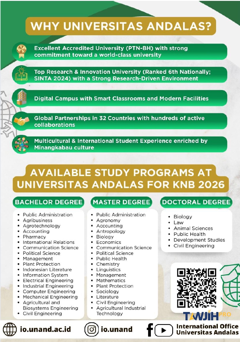 يمكنك أيضاً زيارة الموقع الرسمي لجامعة Andalas للحصول على تفاصيل إضافية حول البرامج: https://io.unand.ac.id/