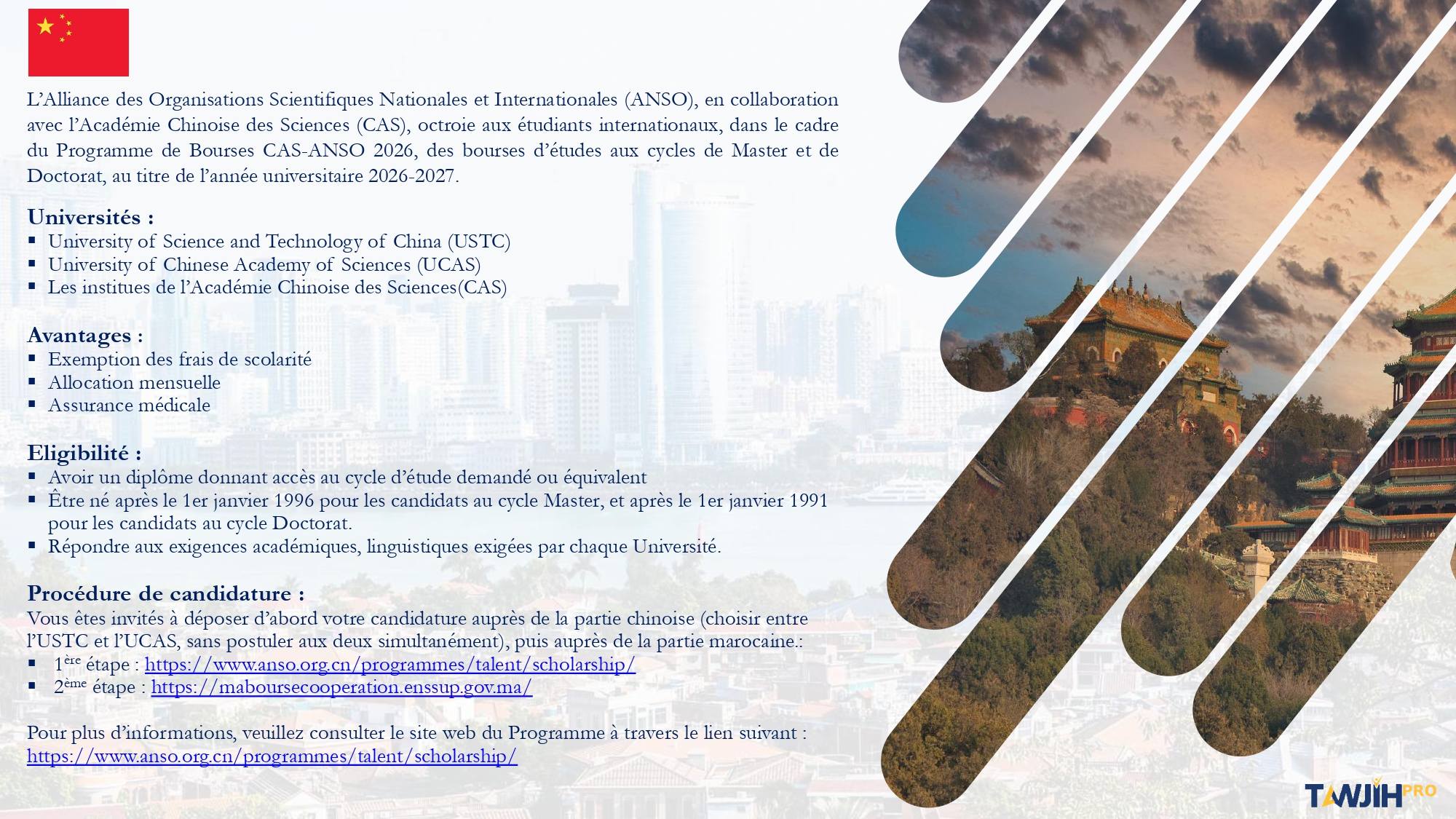 تعلن الأكاديمية الصينية للعلوم (CAS) بشراكة مع تحالف المنظمات العلمية الوطنية والدولية (ANSO) عن فتح باب الترشيح للاستفادة من منحة CAS-ANSO، لفائدة الطلبة الدوليين، لمتابعة الدراسة بسلكي الماستر والدكتوراه بالصين.
