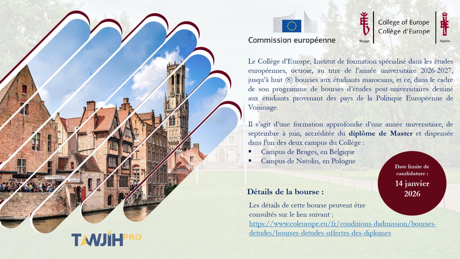 إذا كنت طالبًا طموحًا وتفكر في متابعة دراسات معمّقة في مجالات السياسات الأوروبية، العلاقات الدولية، الاقتصاد، القانون، أو الدراسات متعددة التخصصات، فإن منحة College of Europe تُعد من أفضل الفرص المتاحة لك، المعروفة بجودة تكوينها، بطابعها الانتقائي، وبشبكة خريجيها المنتشرين في مؤسسات الاتحاد الأوروبي والمنظمات الدولية.