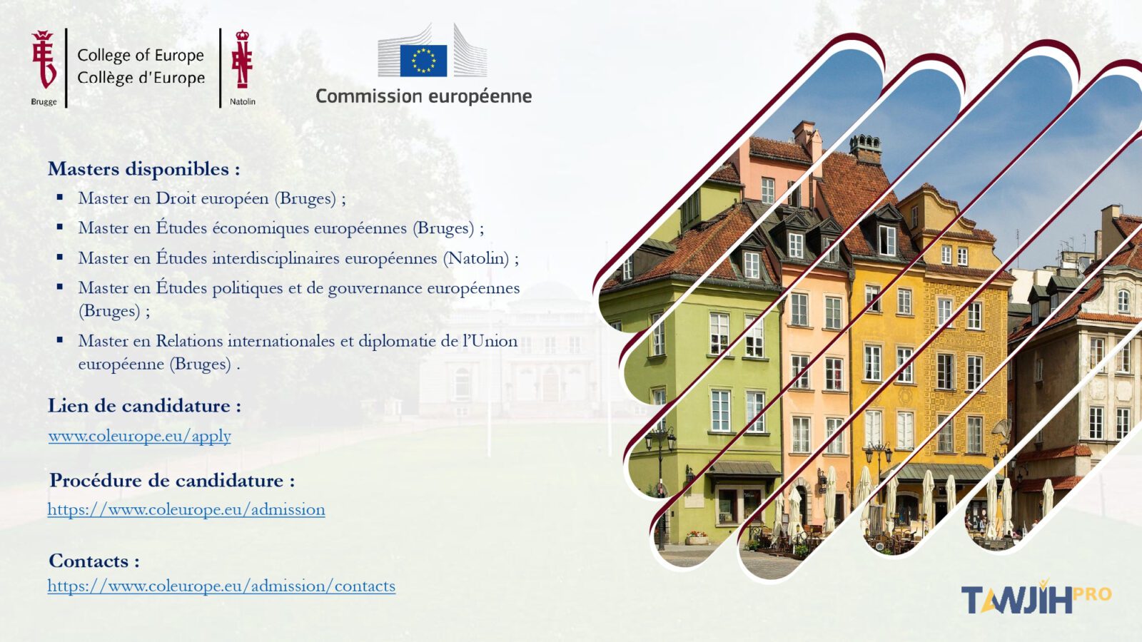 تقدم College of Europe ما يصل إلى ثماني (8) منح كاملة ضمن برنامج خاص بطلبة دول الجوار الأوروبي، وتشمل هذه المنح سنة جامعية متكاملة من شتنبر إلى يونيو، في أحد الحرمين: Campus de Bruges (بلجيكا) أو Campus de Natolin (بولونيا).