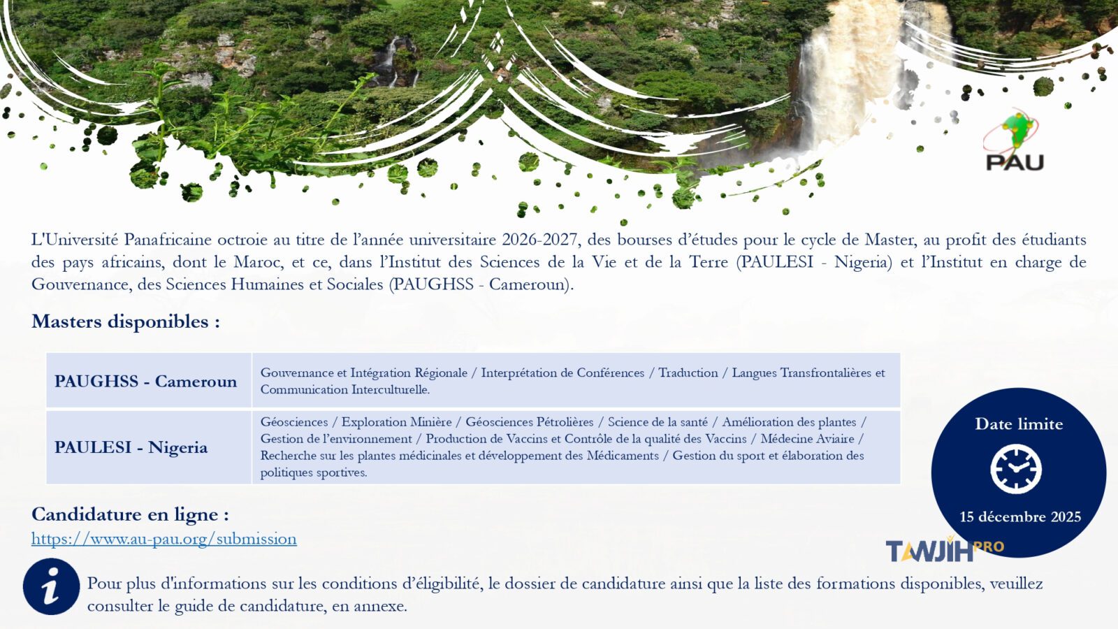 تُعد منحة Pan African University – PAU واحدة من أقوى المنح الموجهة للطلبة الراغبين في متابعة تكوين متقدم داخل مؤسسات معترف بها على الصعيد الإفريقي. هذه المبادرة، التي يُشرف عليها الاتحاد الإفريقي، تمنح إمكانية متابعة الماستر في عدد من التخصصات العلمية والإنسانية الموزعة بين معاهد في نيجيريا والكونغو/الكاميرون، مع تغطية شاملة لمصاريف الدراسة والمعيشة، مما يجعلها من أفضل الخيارات أمام الطلبة الباحثين عن تكوين رصين، بآفاق مهنية واسعة داخل القارة وخارجها.