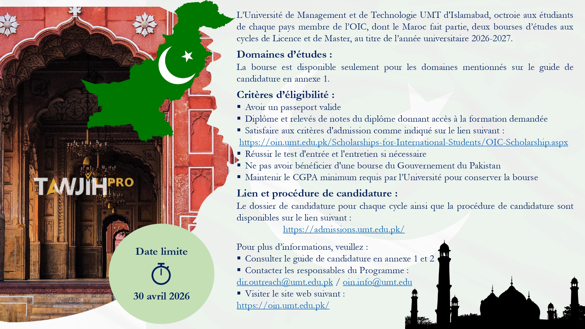 إذا كنت تبحث عن فرصة لمتابعة دراستك الجامعية خارج البلاد بتمويل مهم وفي جامعة دولية، فبرنامج منحة UMT OIC في باكستان يعد من الفرص التي يمكن أن تفتح لك آفاقا علمية ومهنية جديدة. هذا البرنامج موجه لطلبة الدول الأعضاء في منظمة التعاون الإسلامي، ويتيح عددا محدودا من المقاعد لفائدة الطلبة الراغبين في متابعة الدراسة بسلك الإجازة أو الماستر داخل جامعة University of Management and Technology – UMT.