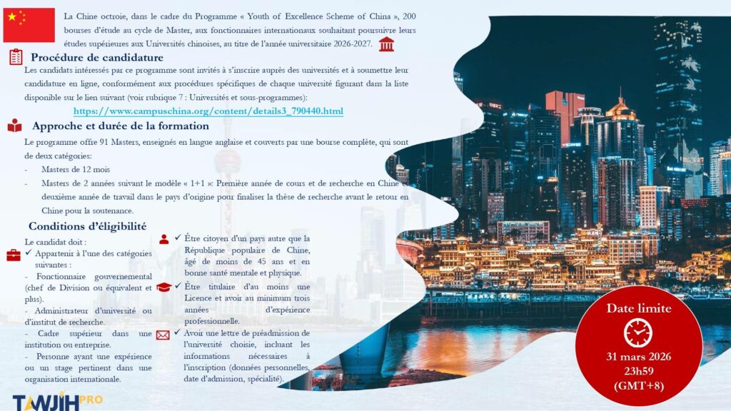 إذا كنتَ تَبحث عن فرصة مميّزة لمتابعة دراستك في مستوى الماستر(Master) في واحدة من أقوى وجهات التكوين في العالم، فبرنامج منحة Youth of Excellence Scheme of China يُعتبر واحداً من أفضل الخيارات المتاحة. المنحة تمنحها الصين كل سنة، وخصصت خلالها 200 مقعداً للطلبة المهتمين باستكمال مسارهم في جامعات صينية معروفة بجودة تكويناتها وبحثها العلمي.