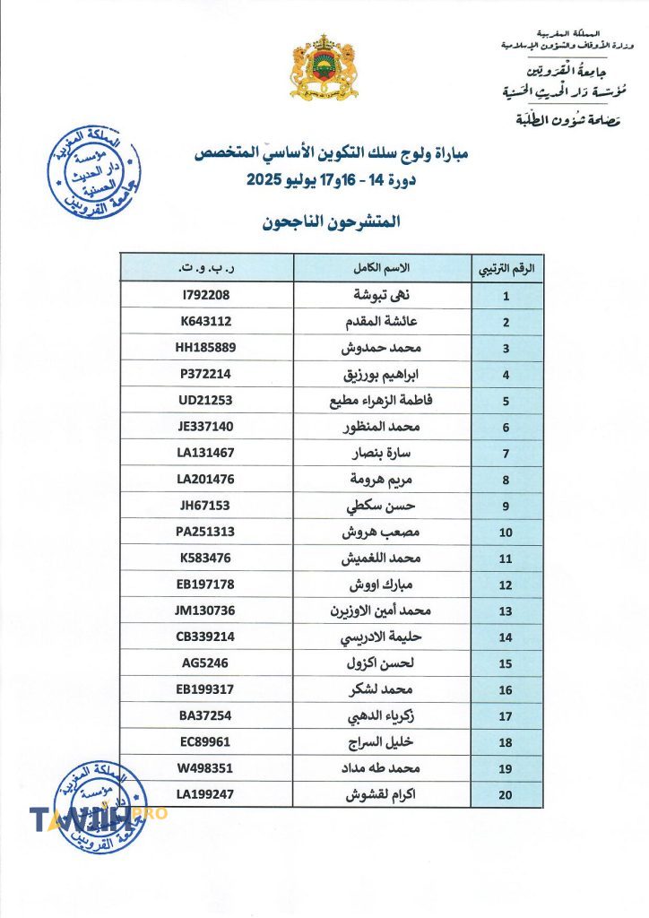 أعلنت دار الحديث الحسنية عن النتائج النهائية لمباراة ولوج سلك التكوين الأساسي المتخصص بدار الحديث الحسنية برسم السنة الجامعية 2025-2026.