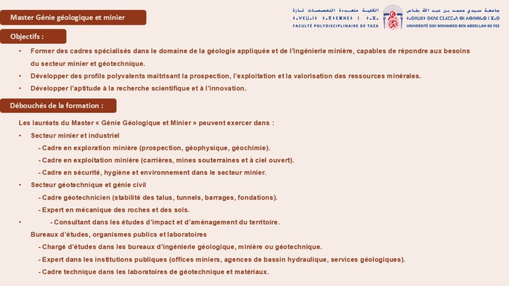 إعداد كفاءات متعددة التخصصات متمكنة من الاستكشاف، والاستغلال، وتثمين الموارد المعدنية.