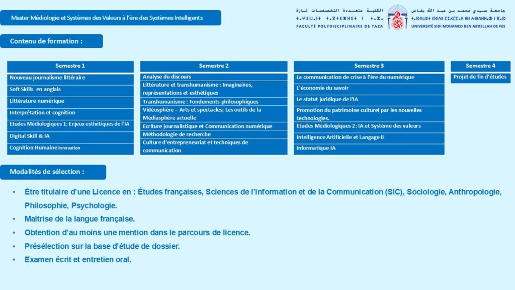 الإجازة في: اللغة الفرنسية، علوم الإعلام والتواصل، علم الاجتماع، الأنثروبولوجيا، الفلسفة، أو علم النفس.