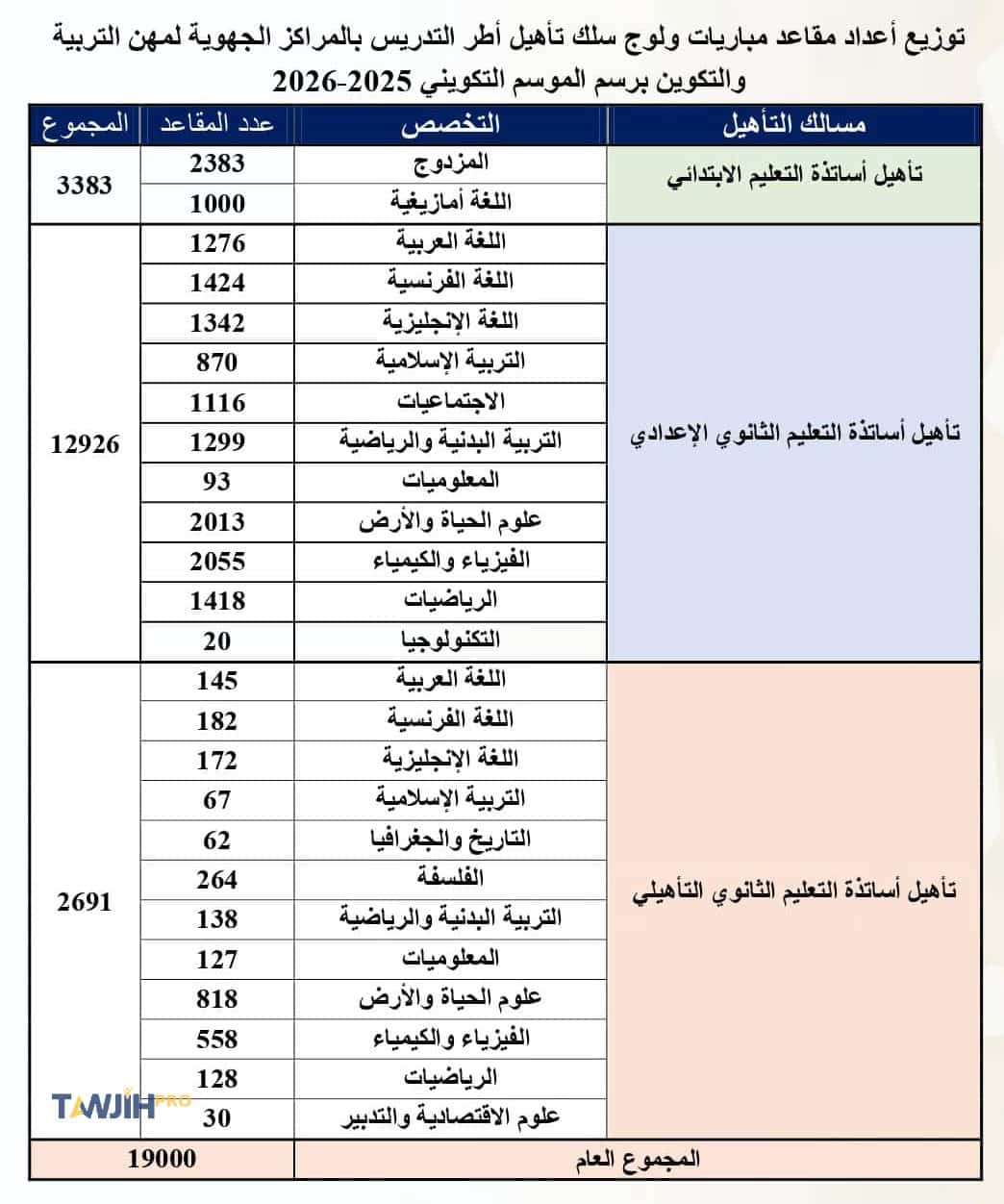 تعلن وزارة التربية الوطنية والتعليم الأولي والرياضة عن إجراء مباريات ولوج سلك تأهيل أطر التدريس بالمراكز الجهوية لمهن للتربية والتكوين، وذلك يوم السبت 22 نونبر 2025 في التخصصات المعنية ووفق عدد المقاعد المحددة في الملحق رقم 1 وطبقا للبرمجة الزمنية المحددة في الملحق رقم 2.