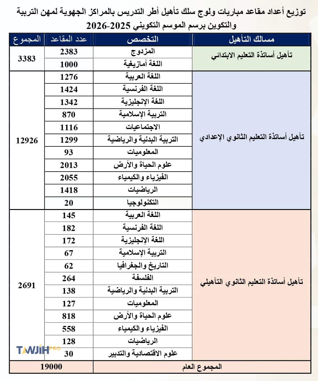 تعلن وزارة التربية الوطنية والتعليم الأولي والرياضة عن إجراء مباريات ولوج سلك تأهيل أطر التدريس بالمراكز الجهوية لمهن للتربية والتكوين، وذلك يوم السبت 22 نونبر 2025 في التخصصات المعنية ووفق عدد المقاعد المحددة في الملحق رقم 1 وطبقا للبرمجة الزمنية المحددة في الملحق رقم 2.