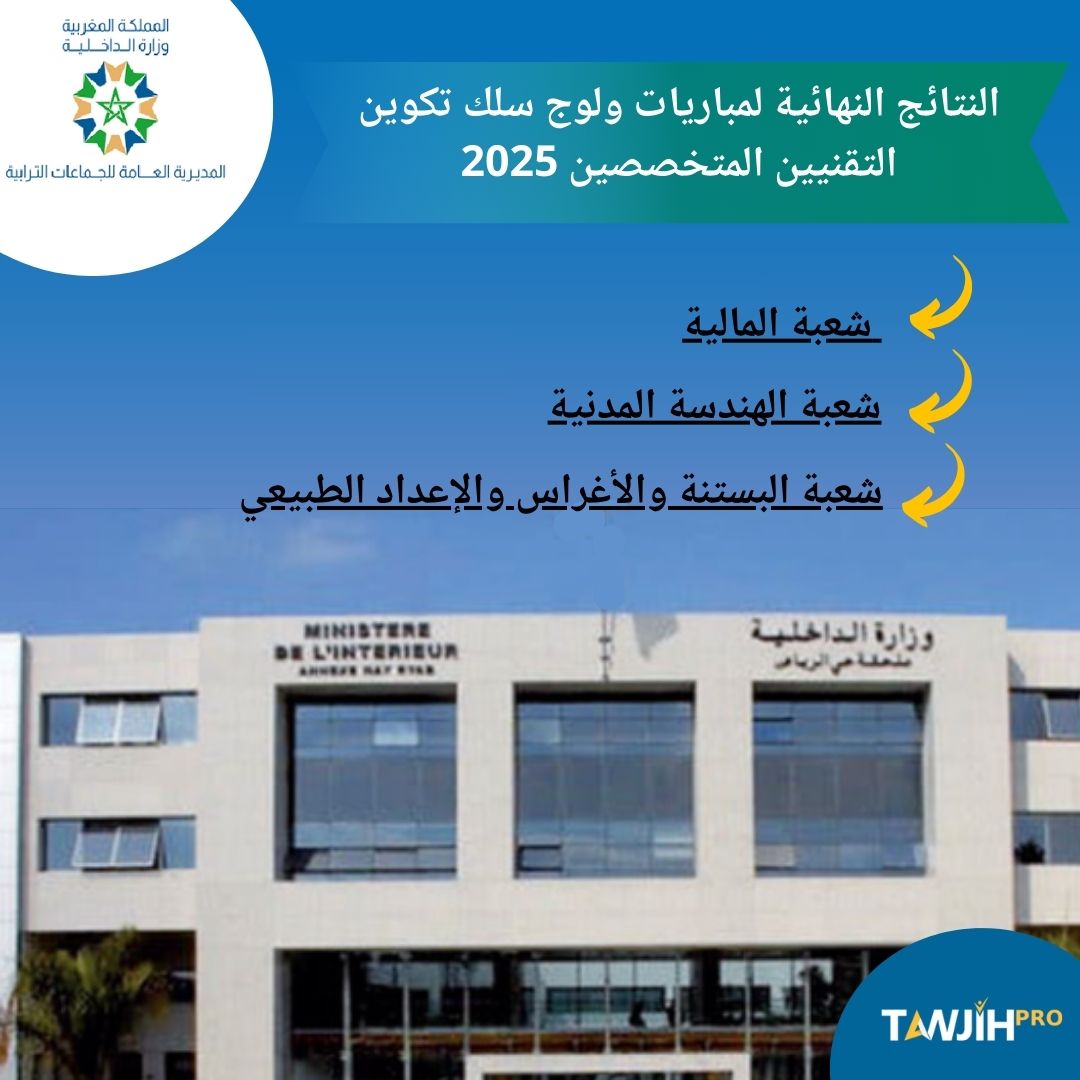 أعلنت وزارة الداخلية عن النتائج النهائية لمباريات ولوج سلك تكوين التقنيين المتخصصين التابعة لوزارة الداخلية في شعبة المالية: تخصص المالية المحلية – شعبة الهندسة المدنية: تخصص أشغال الجماعات الترابية –شعبة البستنة والأغراس والإعداد الطبيعي: تخصص المساحات الخضراء والتنمية المستدامة.