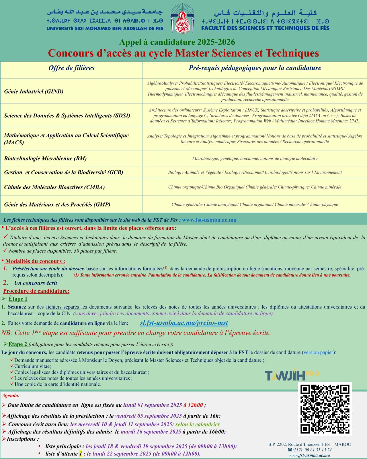 الملفات التقنية للمسالك متوفرة على موقع كلية العلوم والتقنيات بفاس: www.fst-usmba.ac.ma