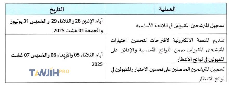 وسيعوض كل مترشح تم قبوله بصفة نهائية ولم يؤكد تسجيله النهائي بمترشح ورد اسمه في لائحة الانتظار الوطنية، وذلك حسب الاستحقاق.