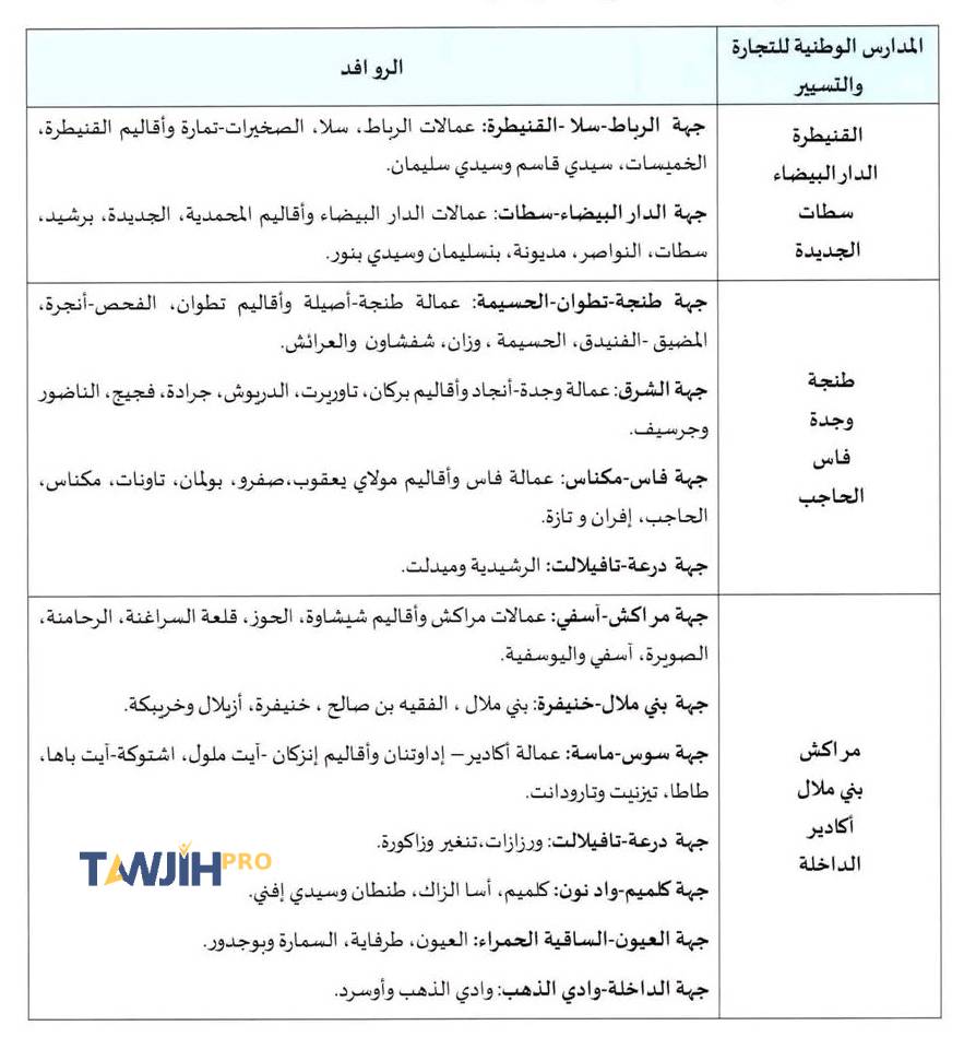 يتم تقديم الترشيحات لولوج السنة الأولى للمدارس الوطنية للتجارة والتسيير حسب مكان الحصول على شهادة البكالوريا، استنادا على التوزيع الجغرافي التالي: