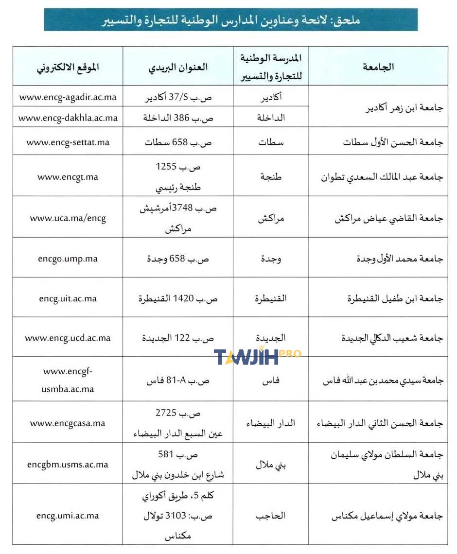 – بالنسبة للحاصلين على شهادة البكالوريا الأجنبية بمؤسسات البعثات الأجنبية داخل التراب الوطني، فيتعين عليهم وجوبا اختيار المدارس الوطنية للتجارة والتسيير استنادا على التوزيع الجغرافي حسب مكان الحصول على البكالوريا؛