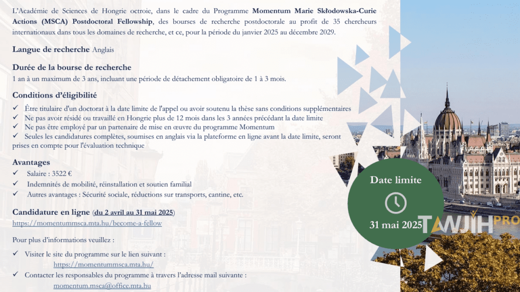 إذا كنت حاصلاً على شهادة الدكتوراه وتطمح إلى تعزيز مسارك الدراسي من خلال تجربة بحثية دولية، فإن برنامج Momentum Marie Skłodowska-Curie Actions (MSCA) الذي تقدمه الجامعة الهنغارية للعلوم يوفر لك فرصة مميزة. يهدف هذا البرنامج إلى دعم 35 باحثًا دوليًا في جميع مجالات البحث خلال الفترة الممتدة من يناير 2025 إلى دجنبر 2029.