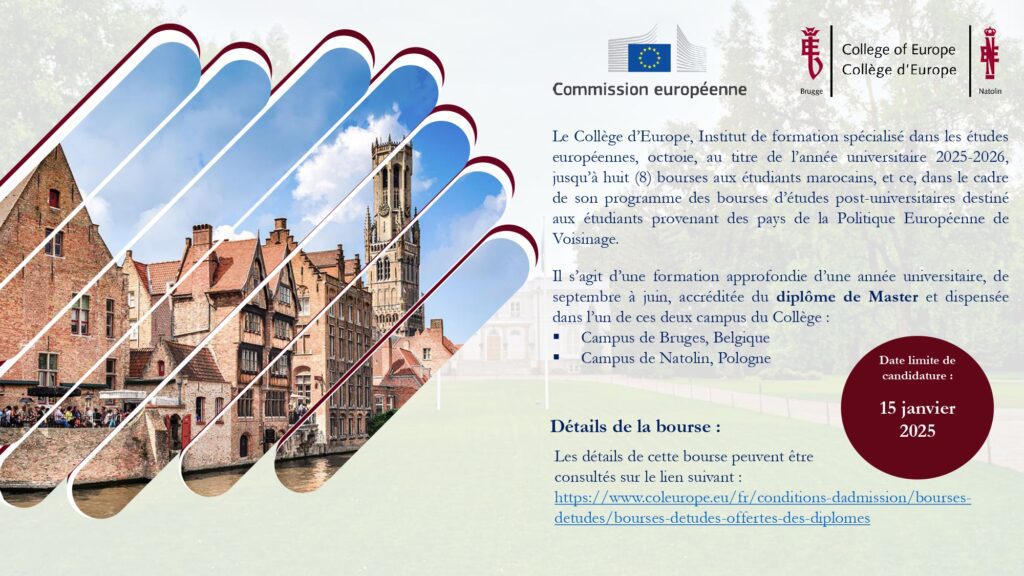 إذا كنت تبحث عن فرصة لتطوير معارفك الأكاديمية في مجال الدراسات الأوروبية، فإن منحة معهد أوروبا (Collège d’Europe) تمثل الخيار الأمثل. يوفر المعهد منحًا دراسية للطلبة المغاربة المتميزين، مما يتيح لهم فرصة الحصول على تعليم متقدم في أرقى التخصصات الأوروبية.